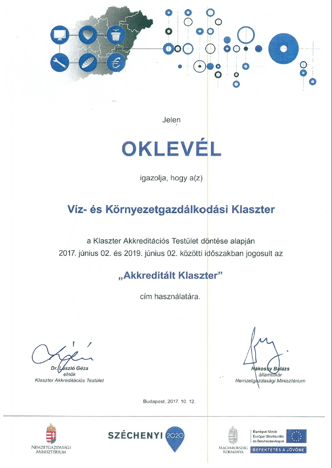 Örömmel jelezzük minden Tagunknak, hogy klaszterünk AK-2016 kódszámmal benyújtott az „Akkreditált Klaszter” cím elnyerésére pályázaton sikeresen szerepelt. Az akkreditációs oklevél átvétele 2017. október 12-én, ünnepélyes keretek között megtörtént a Nemzetgazdasági Minisztérium épületében.